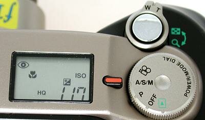 Сверху камеры расположена кнопка спуска, которую окружает колечко, контролирующее приближение. Во время просмотра отснятых фотографий, оно увеличивает или уменьшает изображение. Также сверху расположен дисковый переключатель режимов (Mode Dial), служащий выключателем камеры.