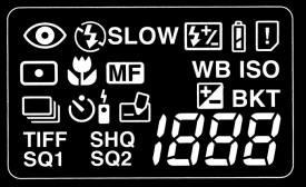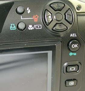 - Под ней расположена кнопка, включающая режим "Macro" и метрическую систему "Spot" (Macro mode/Spot metering button). В режиме воспроизведения помечает, что фотографии содержат информацию DPOF.