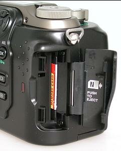 С правой стороны камеры расположен слот для карт памяти SmartMedia. Камера комплектуется картой памяти Olympus SmartMedia на 8 Мб. Камера воспринимает любые карты памяти 3.3v SmartMedia от 2 Мб до 64 Мб.