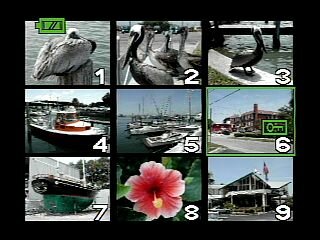 Как большинство цифровых камер, С-3030 может отображать на экране уменьшенные фотографии, находящиеся на карте памяти. В зависимости от установок, на дисплее могут отображаться или 9 маленьких фотографий, или 4, но большего размера. Как можно увидеть на картинке сверху, шестой кадр защищен от удаления (о чем говорит зеленая иконка).