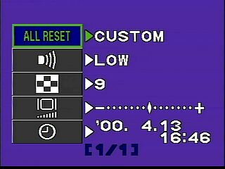 Нажатие на кнопку меню в режиме воспроизведения выводит на дисплей меню с тремя опциями. Первая опция включает режим слайдшоу. Опция "Info" включает или отключает отображение подробной информации об экспозиции. Иконка с микрофоном включает воспроизведение звуковых комментариев.