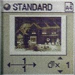 В этом режиме принтер печатает одну или несколько фотографий на одной странице (до 16 на листе формата А4, и до 6 на листе формата А5). После включения режима "Standard", на ЖК-дисплее появляется первая выбранная фотография. Индикатор внизу показывает, какая фотография из общего числа выделенных фотографий отображается в данный момент на экране. Перемещение по выбранным картинкам осуществляется при помощи кнопок со стрелками. Также внизу дисплея отображается число копий данной фотографии, которые будут напечатаны (на картинке - х1 - одна копия). Это число может изменяться при помощи вертикальных кнопок со стрелками (до 50).