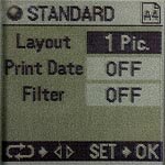 Для вызова меню этого режима (Standard Menu) используется кнопка "Menu". В нем доступны следующие опции: "Layout", "Print Data" (On/Off) и "Filter" (On/Off). Чтобы посмотреть возможное положение фотографии на странице, следует выбрать опцию "Layout" и нажать кнопку "ОК". Дополнительный опции "Layout" могут быть просмотрены при помощи горизонтальных кнопок со стрелками. Чтобы на фотографии пропечаталась дата и время, следует включить опцию "Print Data". Опция "Filter" изначально имеет два фильтра: "B&W" (черно-белый) и "Sepia". При помощи фильтра "B&W" получается монохромная версия цветной фотографии, а при помощи фильтра "Sepia" получается черно-белая фотография в коричневых тонах, напоминающая старинную фотографию.