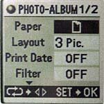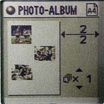 Режим "Photo-Album" Этот режим позволяет печатать несколько фотографий на одной странице, позиционировать их и задавать фон. На ЖК-дисплее фотографии отображаются со своими номерами и общим числом выбранных фотографий. При помощи опции "Paper" задается положение альбомной страницы (горизонтальное или вертикальное). Опция "Layout" позволяет выбрать несколько различных вариантов расположения фотографии на странице (в зависимости от ориентации страницы), количество фотографий на странице и размер самой страницы (возможно выбрать 12 положений для формата А4 и 10 для формата А5). Также доступны опции: "Print Date", "Filter", "Stamp", "Frame" и "Background".