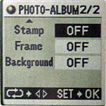 Опция "Frame" позволяет выбрать семь вариантов обрамления фотографии: Off, Black Line, White Line, Shadow, Shade Off, Metal и Wood. При помощи опции "Background" выбирается фоновая картинка. В качестве фоновой картинки может быть использована одна из заложенных в память принтера, загруженная с прилагаемого CD или любая другая (загруженная и зарегистрированная через меню Background Setup).