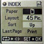 Этот режим позволяет напечатать на одном листе уменьшенные копии всех изображений, находящихся на карте памяти. При переключении в режим "Index" (при помощи дискового переключателя режимов), все фотографии, находящиеся на карте памяти, отображаются на ЖК-дисплее в виде маленьких серых квадратиков. Затем выбирается положение бумаги (горизонтальное или вертикальное). В зависимости от размера бумаги, на одном листе может поместится до 260-ти фотографий с именами файлов и датой (если хватает места). Например на листе бумаги формата А4 при вертикальном положении может поместится 45 или 260 фотографий.