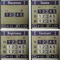 P-400 позволяет произвести небольшую коррекцию изображения при печати с карты памяти. Этот режим активизируется при установке дискового переключателя режимов в положение "Setup" и выборе опции "Image Adjustment". После выбора этой опции и нажатия одной из горизонтальных кнопок со стрелками на экране появляется вспомогательное меню. Оно дает возможность регулировать резкость (Sharpness), гамму (Gamma), яркость (Brightness) и контрастность (Contrast). Каждая регулировка имеет 5 значений.