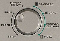 Дисковый переключатель режимов (Mode dial): имеет четыре функциональные установки: "Input" позволяет выбрать один из четырех способов загрузки изображений - с карт памяти Smart Media, PC Card, через порт USB или через параллельный порт; "Paper" используется для выбора типа бумаги (А4 или А5); функция "Setup" позволяет выбрать одну из четырех опций меню - "Image Adjustment" (регулировка резкости), "Gamma", "Brightness" и "Contrast". Basic Setup выставляет все значения по-умолчанию или включает демо-режим, используемый в выставочных и демонстрационных залах. Background Setup позволяет выбрать фоновую картинку и воспроизводить ее с различными эффектами. Download позволяет загрузить больше фоновых изображение и иллюстрированных марок на компьютер. Функция "Picture Select" на дисковом переключателе позволяет выбрать картинку, использую кнопки со стрелками ее можно передвигать по ЖК-дисплею и подтвердить нажатием кнопки "OK/Select".