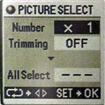 Если требуется распечатать все фотографии, находящиеся на карточке, следует внизу меню "Picture Select" активизировать функцию "All Select". После нажатии кнопки "ОК", все фотографии будут распечатаны. Стоит помнить, что при использовании функции "All Select", принтер не позволяет выставить число копий для каждой фотографии, обрезать фотографии и использовать информацию DPOF изначально записанную в цифровой камере.